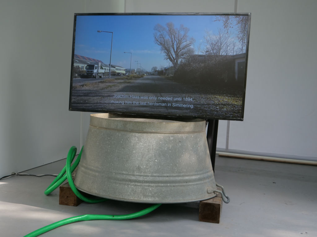 Ein Video und eine Geschichte, eine Tränke, ein Schlauch, Samen und ein Tierhuf bilden eine Installation. Weidetiere sind aufgrund ihres langsamen Abfressens und Stehenlassens von speziellen Pflanzen auf einer Wiese eine besondere Art der Landschaftspfleger*innen. Ihre kurzen Wanderungen auf der Fläche, die permanente Losung die sie dabei fallen lassen und die Trittschäden die sie am Boden hinterlassen, gestalten Mosaiklandschaften. Diese sind durch ihre mosaikartige Pflanzendecke von unterschiedlichen Pflanzenarten gekennzeichnet. In Zeiten von multiplen Krisen sollten die noch vorhandenen Ökosysteme einer Stadt geschützt und gepflegt werden. Diese Aufgabe können Weidetieren übernehmen. Mit der künstlerischen Arbeit stellt die Künstlerin einen speziellen Aspekt der Wiener Stadtnutzung in Frage und stellt die Frage nach verdrängter städtischer Lebenskultur mit Tieren auf Weiden.