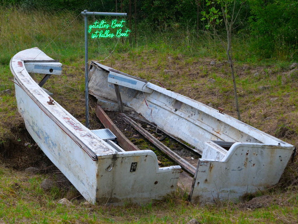 Träume und Hoffnungen führen Menschen weg von zu Haus. Sie brechen auf um neue Leben zu beginnen. Ein zerschnittenes Boot symbolisiert die Zerbrechlichkeit dieser Hoffnungen und die Schwierigkeiten auf den Wegen zum Erreichen der Träume. Sind sie genau so zerbrochen wie das Boot?
