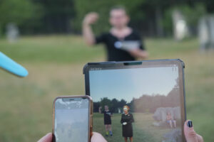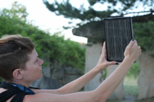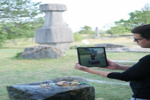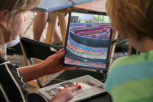 Mit Tablet oder Smartphone können am Gelände verortete, virtuelle Skulpturen unter freiem Himmel betrachtet werden.